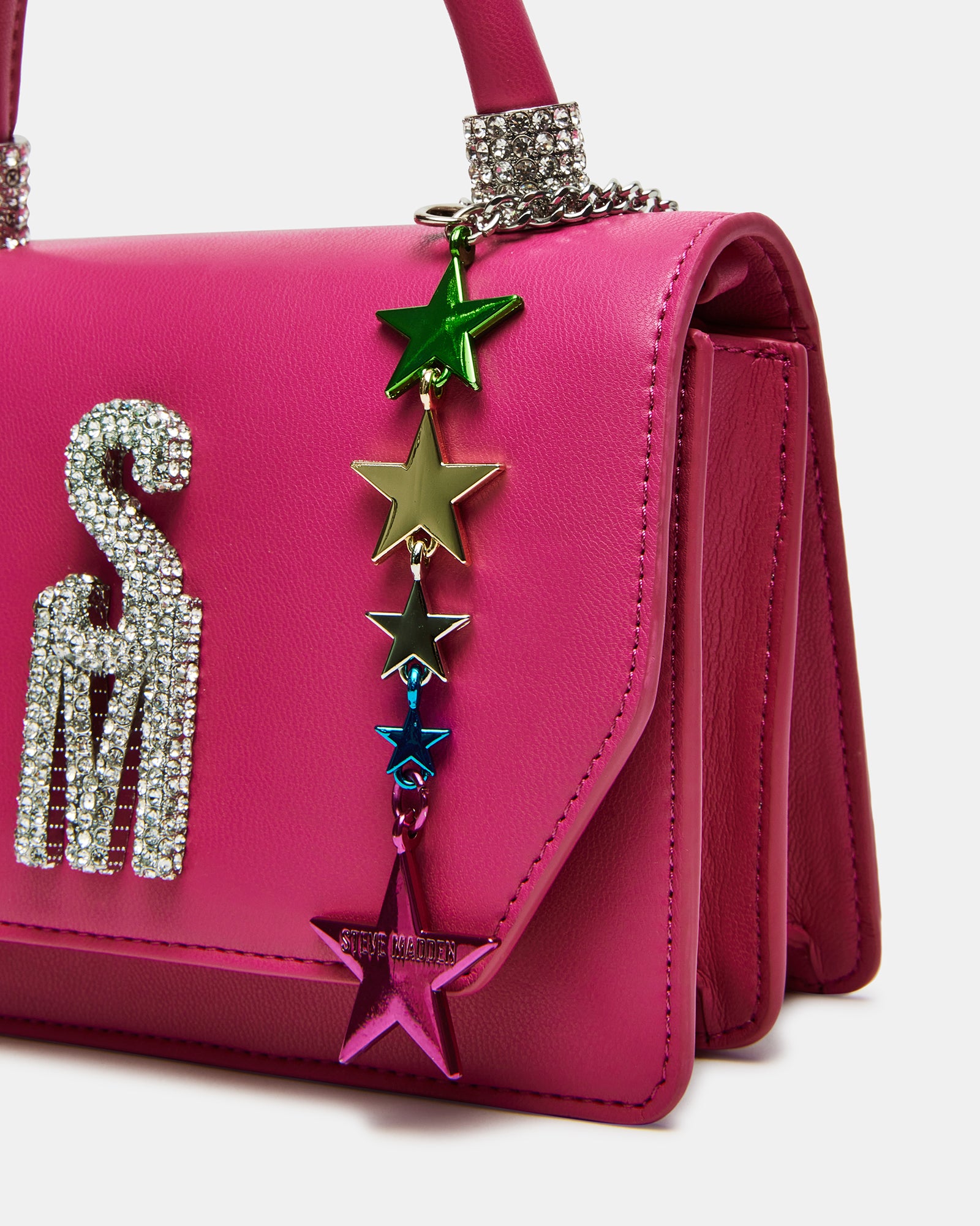 The BRAT mini bag features a top handle and a multi-colored star charm with bubble letter logo letters for a trendy look. With a crossbody strap and interior back wall, it offers convenience and organization while making a stylish statement.