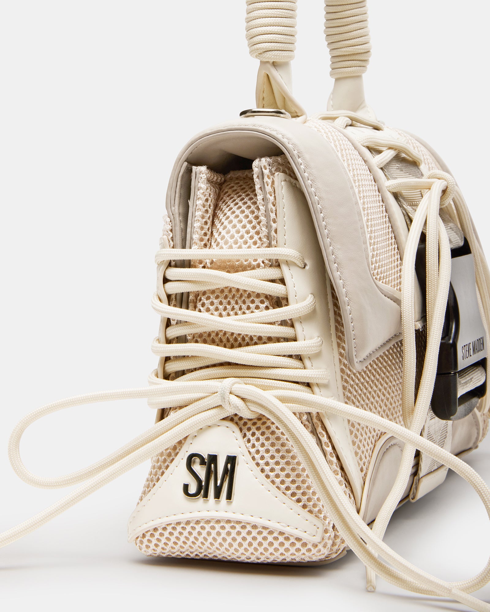 The DIEGO BAG is a structured trapezoid bag with athletic-inspired details like mesh overlay panels, sneaker style lacing, and an oversized quick release buckle closure.