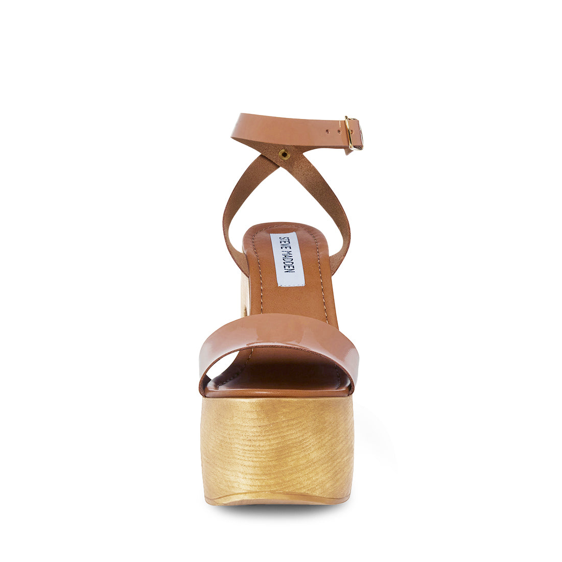 - Crossed ankle straps with buckle closure